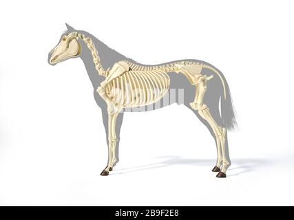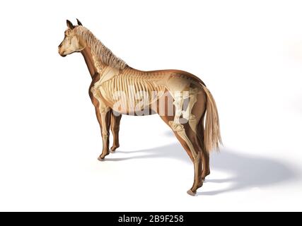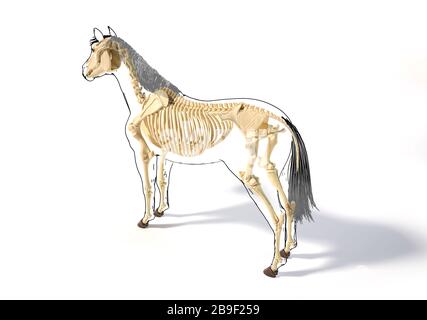 Illustration de côté d'un squelette de cheval superposé sur une silhouette de profil noir. Gravure vintage de 1878.