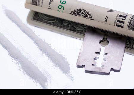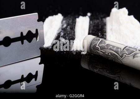 Lame de rasoir libre sur la poudre sur fond noir avec reflet