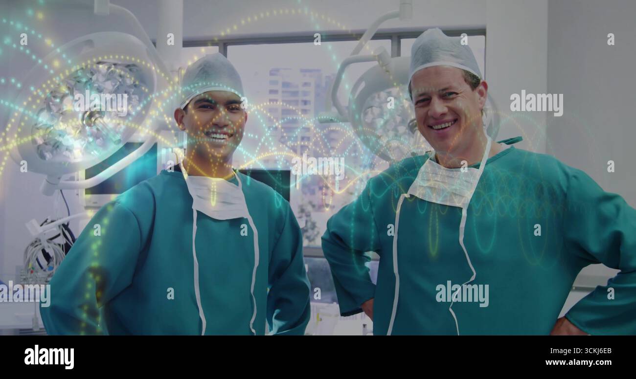Deux chirurgiens portant des gommages verts debout dans la salle d'opération, avec lumières et superposition de forme d'onde Banque D'Imageshttps://www.alamyimages.fr/image-license-details/?v=1https://www.alamyimages.fr/deux-chirurgiens-portant-des-gommages-verts-debout-dans-la-salle-d-operation-avec-lumieres-et-superposition-de-forme-d-onde-image700493427.html