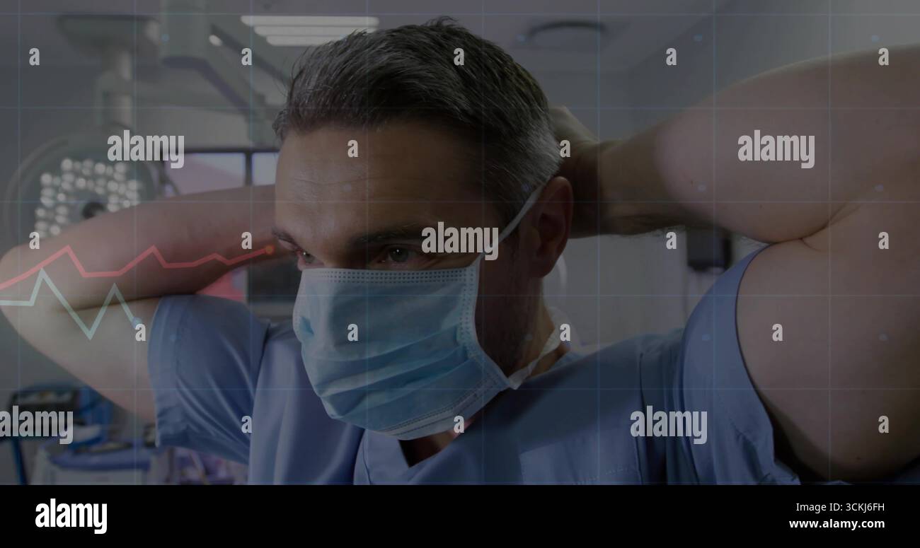 Ajustement du chirurgien dans les frotteurs fixation des sangles du masque dans la salle d'opération, avec tracé du moniteur ECG Banque D'Imageshttps://www.alamyimages.fr/image-license-details/?v=1https://www.alamyimages.fr/ajustement-du-chirurgien-dans-les-frotteurs-fixation-des-sangles-du-masque-dans-la-salle-d-operation-avec-trace-du-moniteur-ecg-image700493461.html