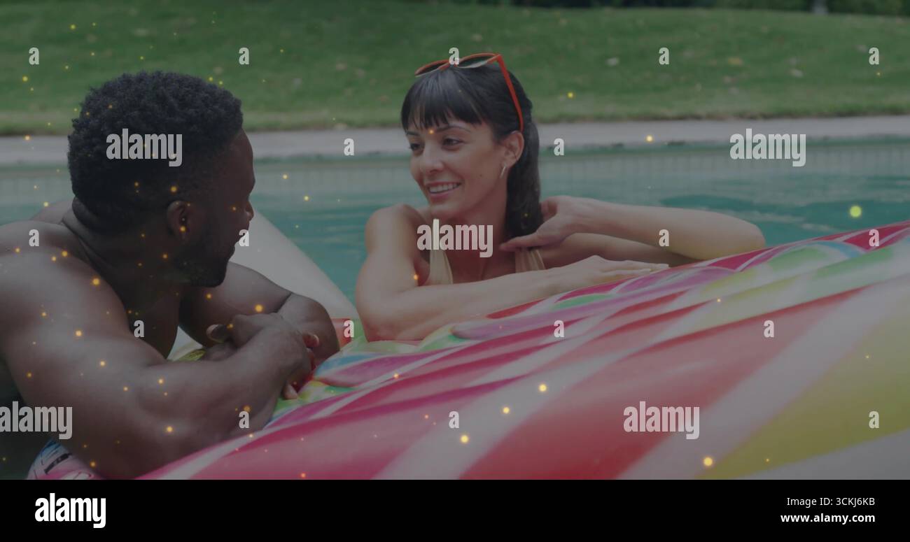 Homme torse et femme portant un maillot de bain flottant sur un flotteur de piscine dans la cour arrière, avec des lunettes de soleil rouges Banque D'Imageshttps://www.alamyimages.fr/image-license-details/?v=1https://www.alamyimages.fr/homme-torse-et-femme-portant-un-maillot-de-bain-flottant-sur-un-flotteur-de-piscine-dans-la-cour-arriere-avec-des-lunettes-de-soleil-rouges-image700493567.html