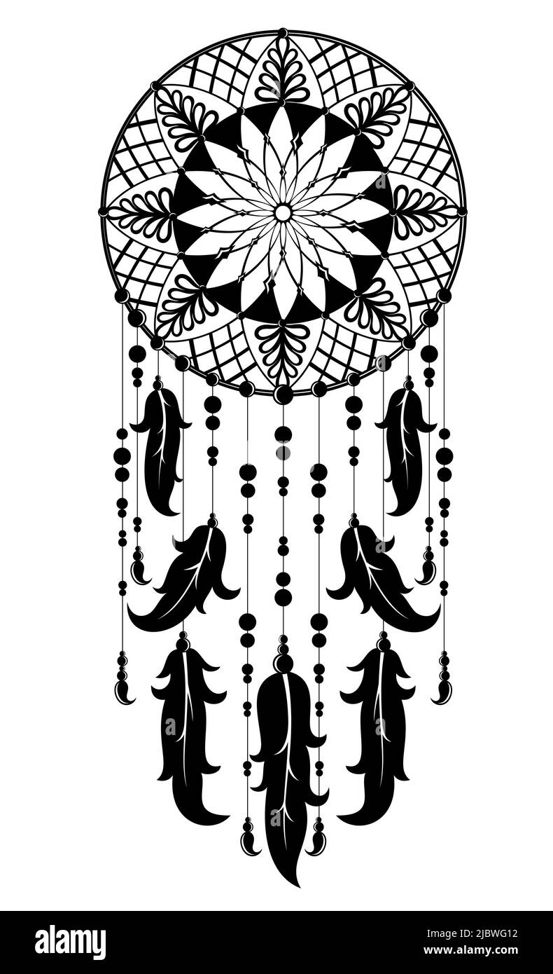 Symbole des Indiens d'Amérique. Attrape-rêves avec plumes d'oiseau ornementées, illustration vectorielle noire isolée sur fond blanc. Élément de mode vintage ethnique dreamcatcher boho. Illustration de Vecteurhttps://www.alamyimages.fr/image-license-details/?v=1https://www.alamyimages.fr/symbole-des-indiens-d-amerique-attrape-reves-avec-plumes-d-oiseau-ornementees-illustration-vectorielle-noire-isolee-sur-fond-blanc-element-de-mode-vintage-ethnique-dreamcatcher-boho-image479491157.html