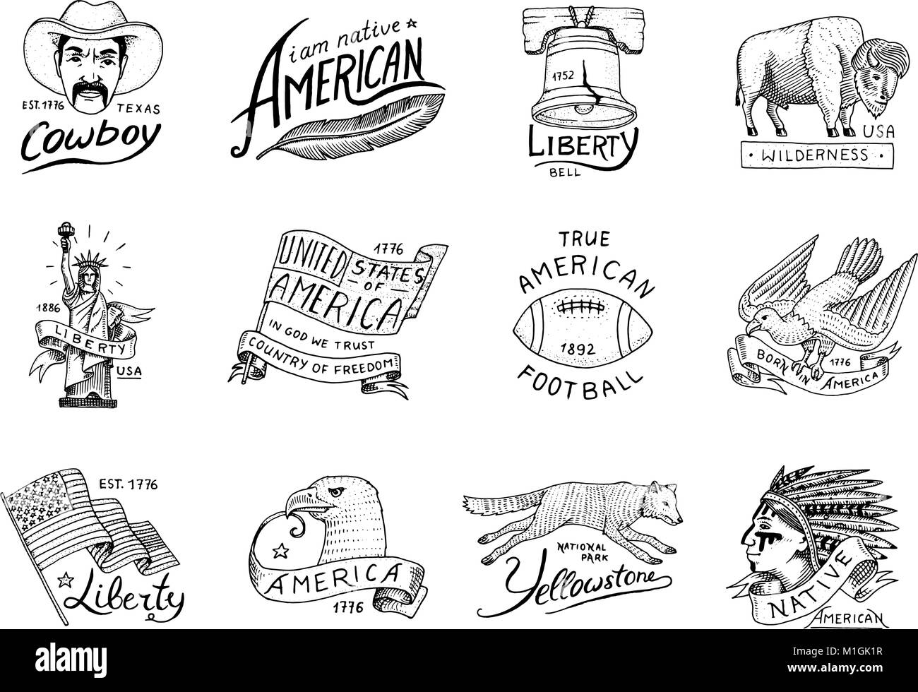 Native American set. vieux, ou étiquettes pour le camping, la randonnée, la chasse et buffalo. Drapeau, aigle et cowboy, le loup avec la peau rouge indien. gravés à la main dans de vieux croquis. Illustration de Vecteurhttps://www.alamyimages.fr/image-license-details/?v=1https://www.alamyimages.fr/photo-image-native-american-set-vieux-ou-etiquettes-pour-le-camping-la-randonnee-la-chasse-et-buffalo-drapeau-aigle-et-cowboy-le-loup-avec-la-peau-rouge-indien-graves-a-la-main-dans-de-vieux-croquis-173084515.html