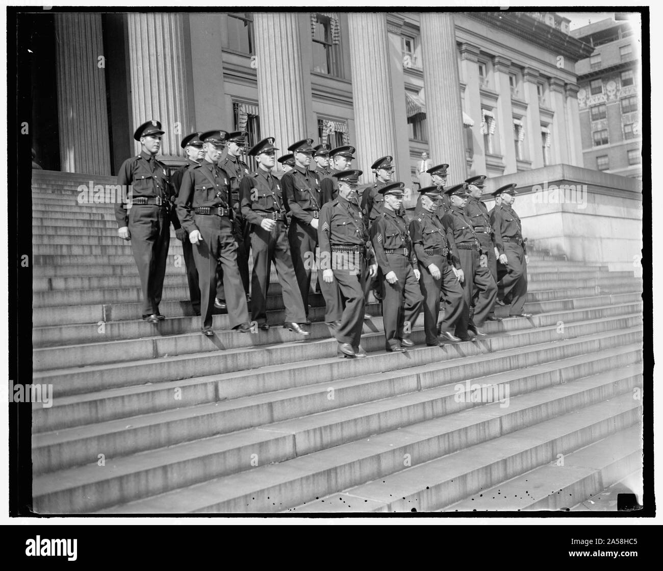 Les gardiens du Trésor américain s'épanouir dans de nouveaux uniformes. Washington, D.C. le 26 août. Le premier acte de la le Service secret des États-Unis lorsqu'ils étaient g même supervision de la garde du Trésor était d'équiper les hommes avec de nouveaux uniformes. Un uniforme d'été de chemise bleue avec un pantalon bleu et ceinture Sam Browne a pris la place du bleu, vert, blanc, rose et autres couleurs contradictoires dans shirts anciennement porté par les gardes. Cette photo a été faite que les gardes ont défilé pour les représentants du Secrétariat du aujourd'hui. 8/26/37 Banque D'Imageshttps://www.alamyimages.fr/image-license-details/?v=1https://www.alamyimages.fr/les-gardiens-du-tresor-americain-s-epanouir-dans-de-nouveaux-uniformes-washington-d-c-le-26-aout-le-premier-acte-de-la-le-service-secret-des-etats-unis-lorsqu-ils-etaient-g-meme-supervision-de-la-garde-du-tresor-etait-d-equiper-les-hommes-avec-de-nouveaux-uniformes-un-uniforme-d-ete-de-chemise-bleue-avec-un-pantalon-bleu-et-ceinture-sam-browne-a-pris-la-place-du-bleu-vert-blanc-rose-et-autres-couleurs-contradictoires-dans-shirts-anciennement-porte-par-les-gardes-cette-photo-a-ete-faite-que-les-gardes-ont-defile-pour-les-representants-du-secretariat-du-aujourd-hui-8-26-37-image330259557.html