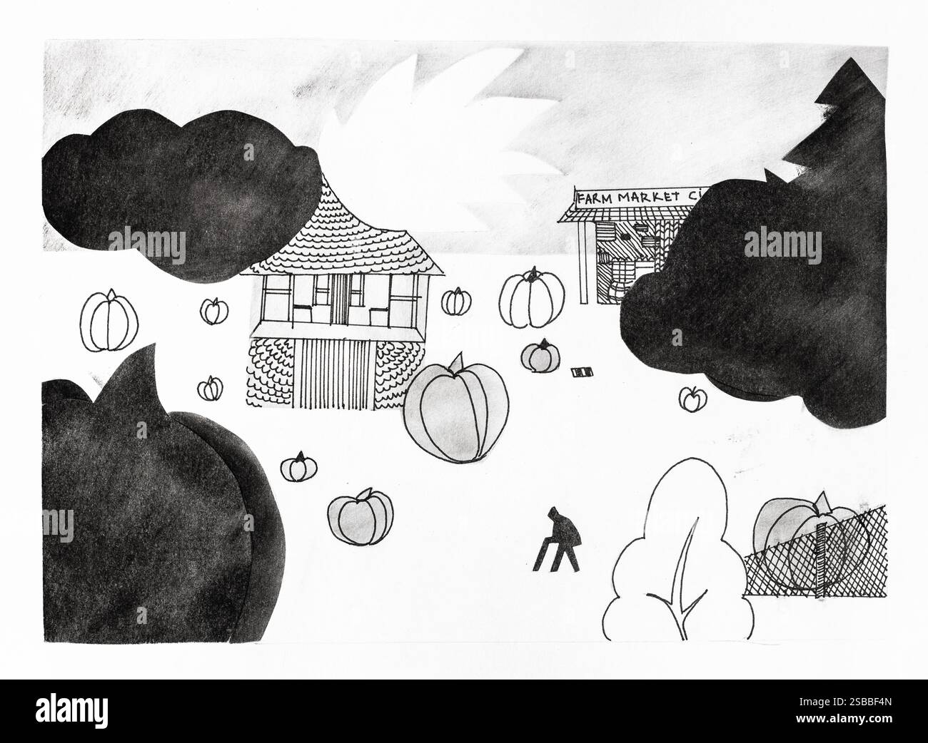 marché agricole dans le village entouré d'énormes fruits et légumes dessinés à la main et imprimés avec pochoir, encre noire et timbres Banque D'Imageshttps://www.alamyimages.fr/image-license-details/?v=1https://www.alamyimages.fr/marche-agricole-dans-le-village-entoure-d-enormes-fruits-et-legumes-dessines-a-la-main-et-imprimes-avec-pochoir-encre-noire-et-timbres-image643798197.html