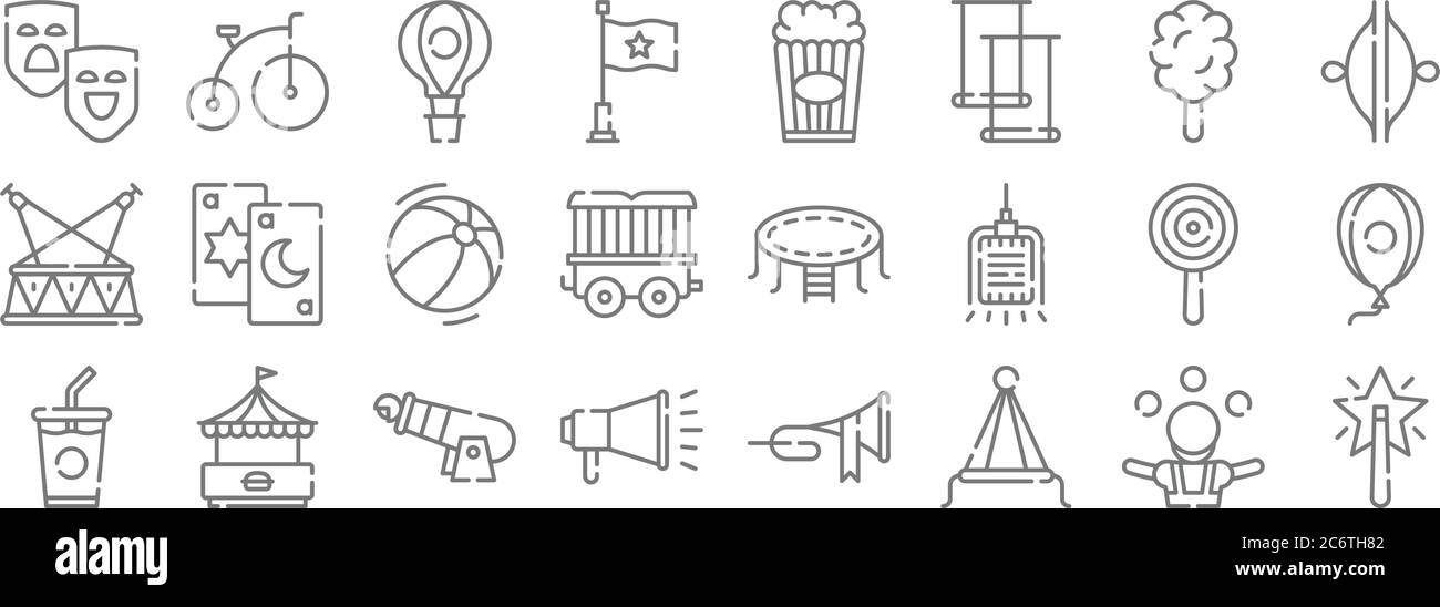 lignes de cirque. ensemble linéaire. lignes vectorielles de qualité telles que baguette magique, chapeau de fête, mégaphone, boisson non alcoolisée, loglop, ballon de plage, cymbales, pop-corn, b Illustration de Vecteurhttps://www.alamyimages.fr/image-license-details/?v=1https://www.alamyimages.fr/lignes-de-cirque-ensemble-lineaire-lignes-vectorielles-de-qualite-telles-que-baguette-magique-chapeau-de-fete-megaphone-boisson-non-alcoolisee-loglop-ballon-de-plage-cymbales-pop-corn-b-image365598044.html