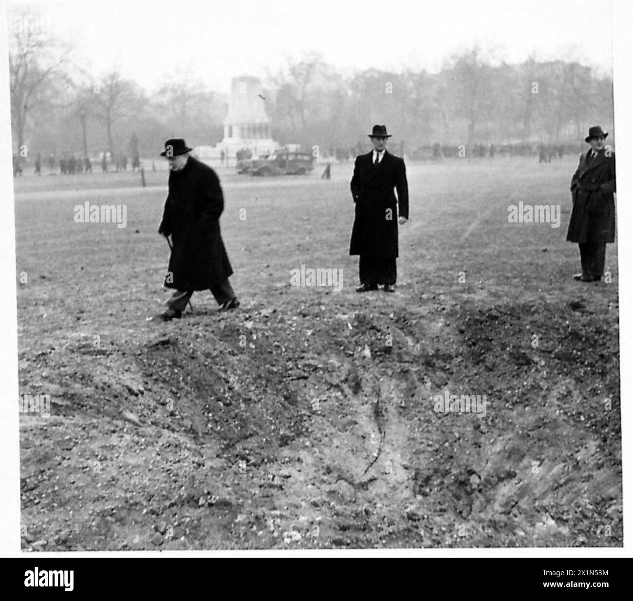 Le premier ministre passe devant un cratère de bombe sur Horse Guards Parade ; l'explosion a causé d'importants dommages au n° 10 Downing Street lors d'un raid. Banque D'Imageshttps://www.alamyimages.fr/image-license-details/?v=1https://www.alamyimages.fr/le-premier-ministre-passe-devant-un-cratere-de-bombe-sur-horse-guards-parade-l-explosion-a-cause-d-importants-dommages-au-n-10-downing-street-lors-d-un-raid-image603442552.html