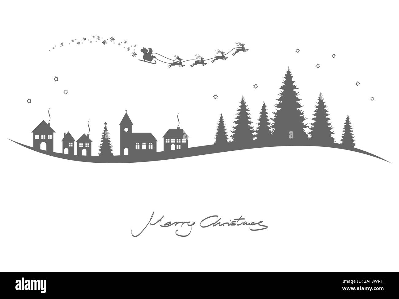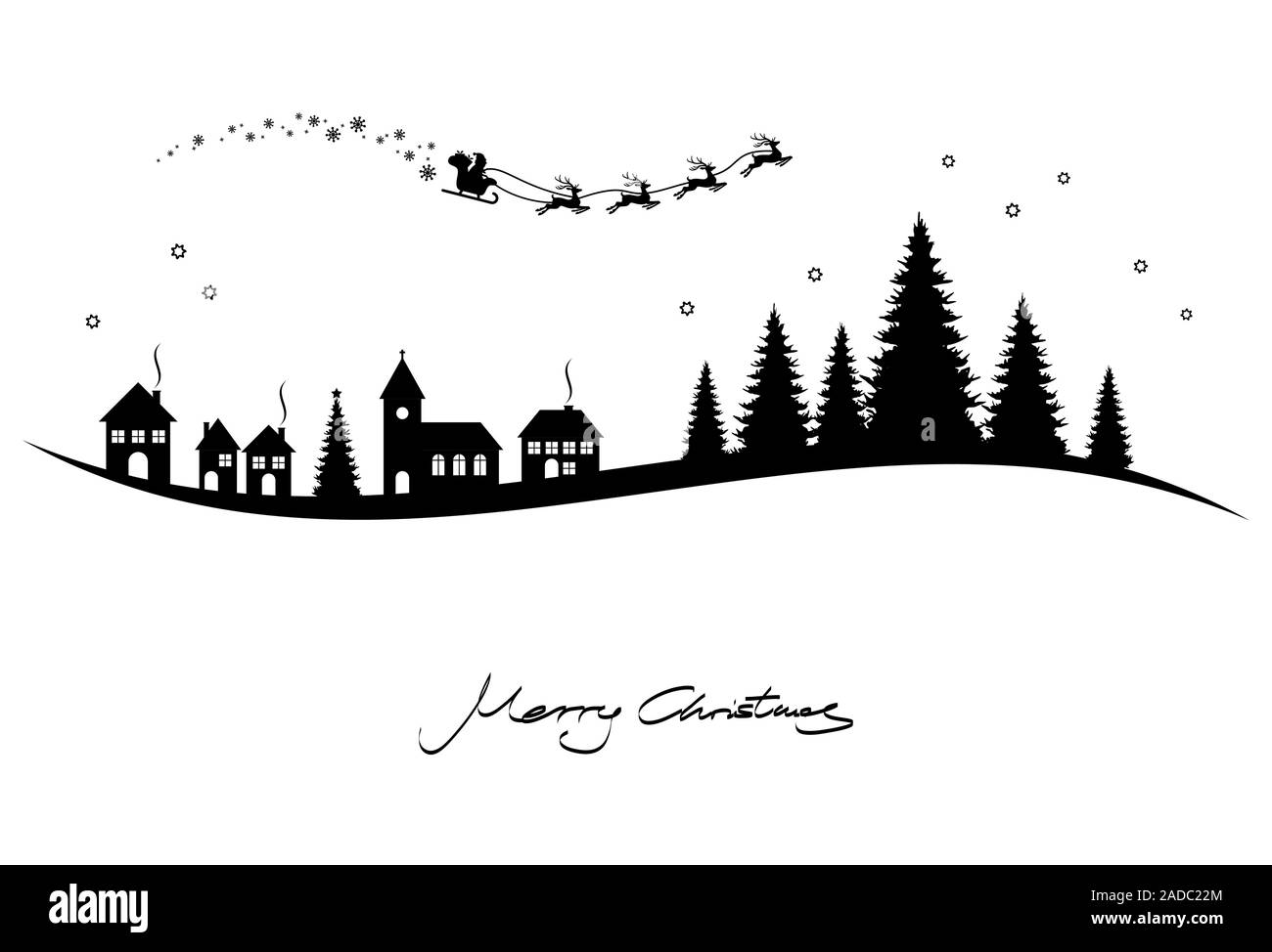 Silhouette de Père Noël avec traîneau et des rennes au cours d'une église, maisons et conifères isolé sur fond blanc avec des vœux de noël et nouvel an Illustration de Vecteurhttps://www.alamyimages.fr/image-license-details/?v=1https://www.alamyimages.fr/silhouette-de-pere-noel-avec-traineau-et-des-rennes-au-cours-d-une-eglise-maisons-et-coniferes-isole-sur-fond-blanc-avec-des-voeux-de-noel-et-nouvel-an-image335252588.html